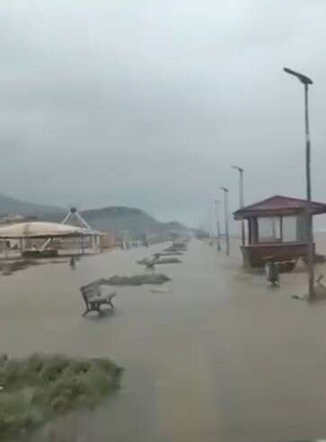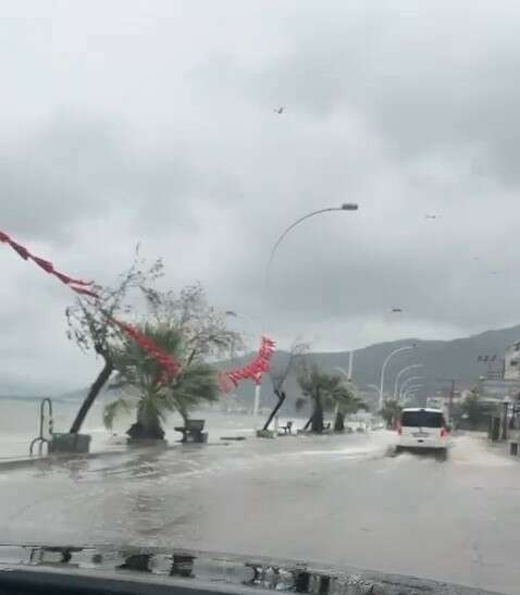 Araçlar yollarda ilerlemekte güçlük çekerken, fırtınanın etkisi vatandaşların kameralarına yansıdı. Deniz ile karayolu birleşirken, binlerce dönüm ekili tarım alanı da sular altında kaldı.