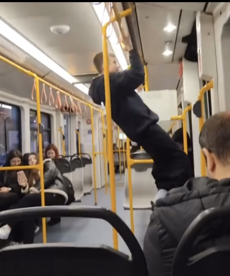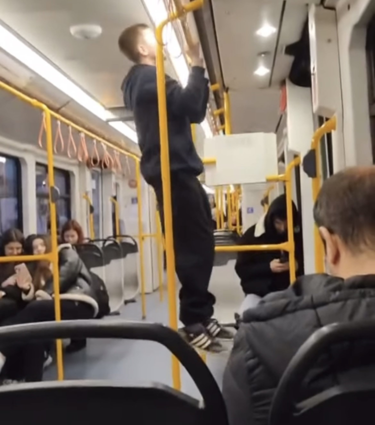 Bursa’nın Osmangazi ilçesinde toplu ulaşım aracı metroyla seyahat eden bir genç, tutunma demirine asılarak barfiks çekti.
