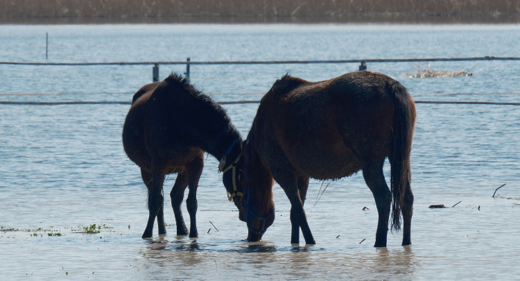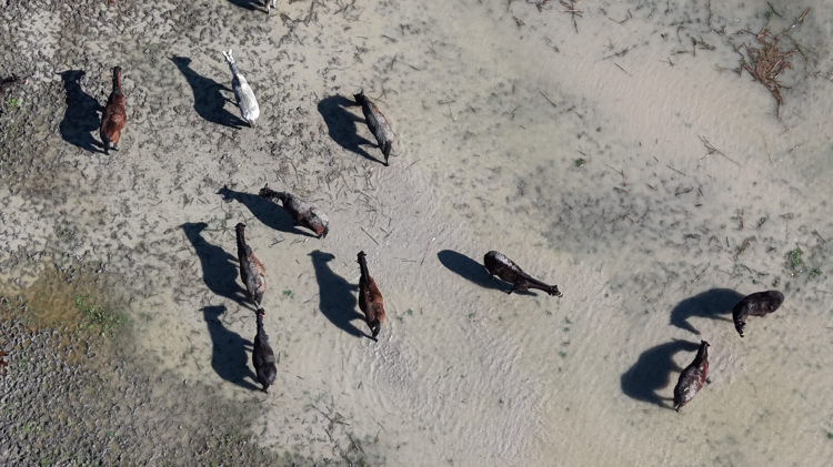 Uluabat Gölü, Bursa-İzmir kara yolunun kıyısına kadar gelirken bölgede bulunan milyonluk yarış atlarının bulunduğu tarlalar da su altında kaldı. Arap ve İngiliz yarış atları, su içinde gezinirken drone ile görüntülendi. Milyonluk tayların annesi olan damızlık atların büyük kısmının gebe olması da dikkat çekti.