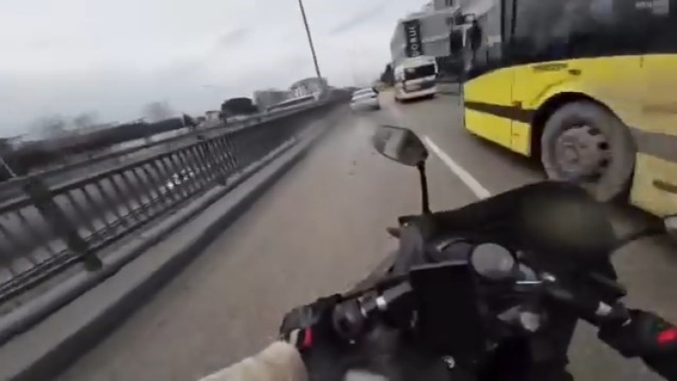 Sağa ve sola doğru yalpalayan motosiklet, sürücüsü kısa bir süre sonra direksiyonu toplamasıyla yoluna devam etti. Yaşanan korku dolu anlar, motosikletlinin kask kamerasına yansıdı.