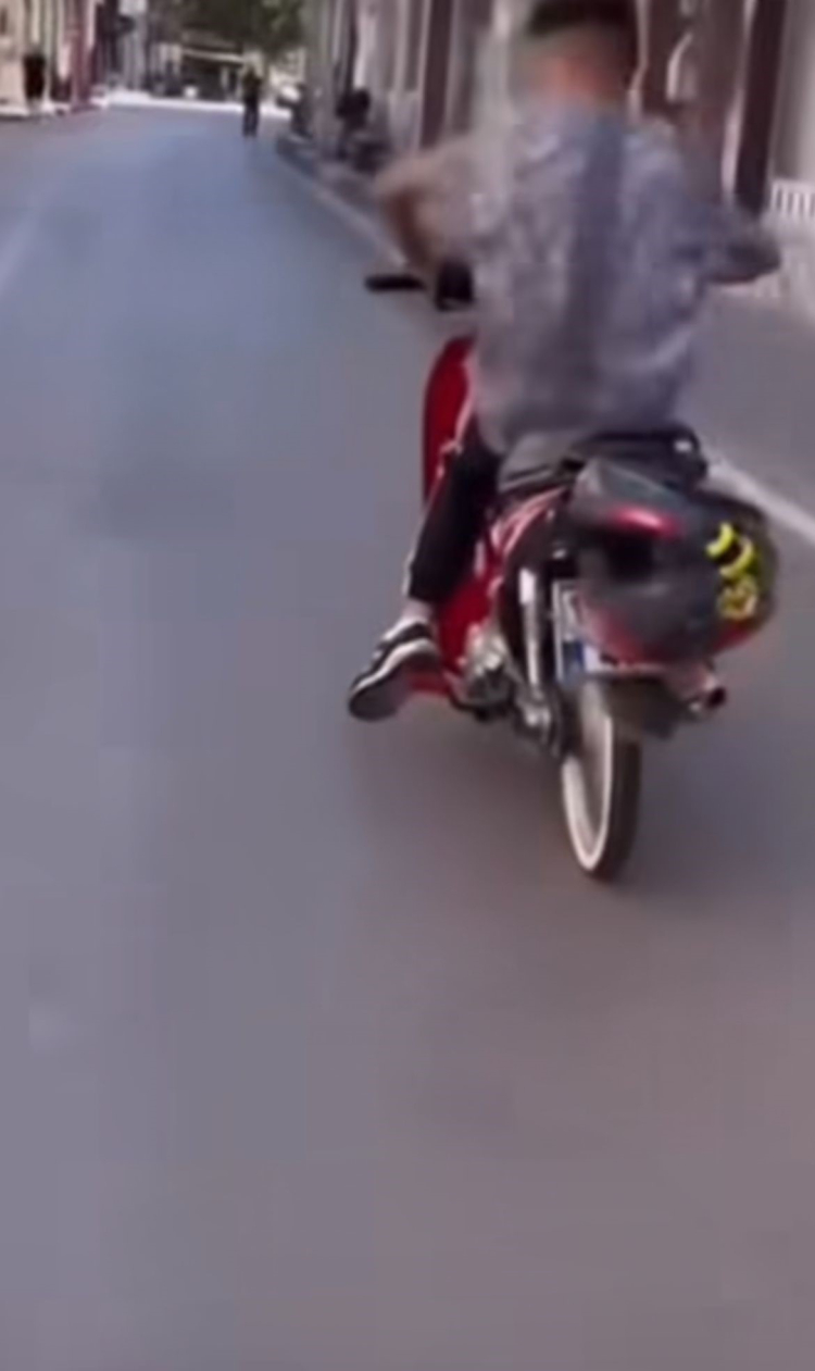 Kask takmadan seyir haline geçen ve ehliyetinin olmadığı iddia edilen sürücü, motosikletin egzozunu bağırtarak ilerlemeye başladı. Çevredekiler olan bitene anlam veremezken, o anlar amatör kameraya yansıdı.