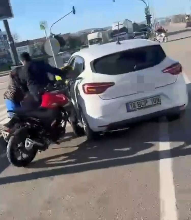 Bursa'da otomobiline çarptığı gerekçesiyle tartıştığı motosiklet sürücüsünü, kaskla darbeden şahıs tutuklandı.