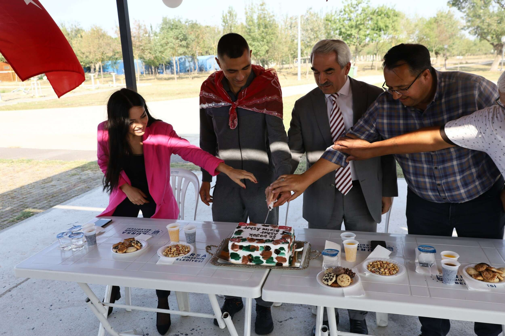 Konuk Evi'nde 2 senedir kalan 30 yaşındaki Turgut Özal Sevinçli, toplumsal hayata tekrar dönebilmek için gerekli mesleki çalışmalara katıldı ve sürekliliği olabilecek düzenli bir işe yönlendirmesi planlandı. Ancak bunun için öncelikle askerlik görevini yerine getirmesi için yönlendirilen Sevinçli, gerekli başvuruları yaptı ve askerlik görev yeri Manisa olarak belirlendi. Bunun üzerine Bursa Büyükşehir Belediyesi Huzurevi Şube Müdürlüğü de Turgut Özal Sevinçli için Erkek Konuk Evi'nde asker eğlencesi düzenledi. Eğlence öncesi asker pastası kesilen Sevinç’in daha sonra ellerine de asker kınası yakıldı. Daha sonra Konuk Evi’nin misafirleri davul zurna eşliğinde gönüllerince eğlendi.