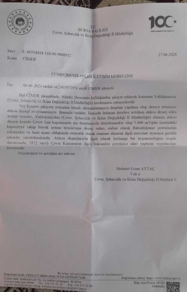 Çevre Şehircilik ve İklim Değişikliği İl Müdürlüğü tarafından CİMER şikayetine verilen cevapta, “İlgili CİMER şikayetinde Nilüfer Deresi'nin kirliliğinden şikayet edilerek, konunun valiliğimizce (Çevre Şehircilik ve İlklim Değişikliği İl Müdürlüğü) incelenmesi istenmiştir.