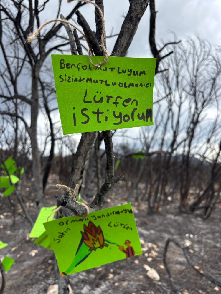 Ulusal bilinç ve sorumluluk bilinciyle hayata geçirilen 'küllerden umuda' projesi çerçevesinde yangınlarda ağır hasar görmüş orman alanları öğrenciler tarafından ziyaret edildi. Öğrenciler, elleriyle fidan dikerek doğanın yeniden filizlenen umuduna tanıklık etti.