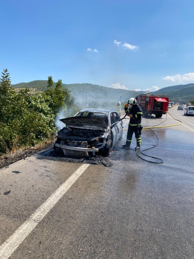 Bursa'nın İznik ilçesinde bir otomobil, yolun ortasında cayır cayır yandı.