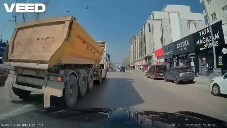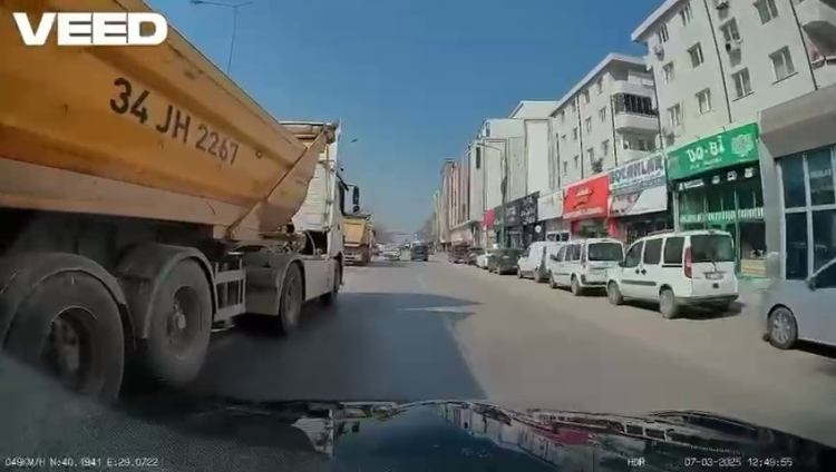 Akan trafikte seyir halinde olan otomobilin önüne bir anda 34 JH plakalı kamyon atladı. Otomobil sürücüsü, manevra ile kazayı önlerken tehlikeli anlar saniye saniye araç içi kamerasına yansıdı.