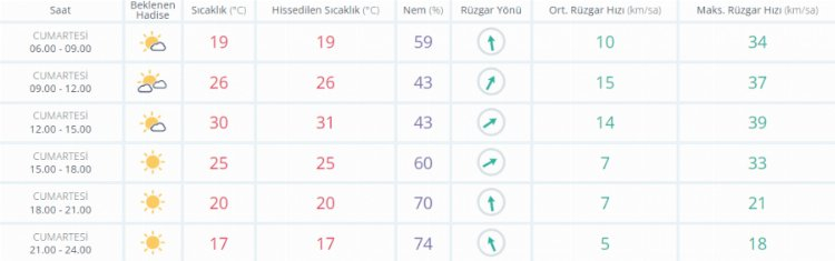 Meteoroloji Genel Müdürlüğü, cumartesi günü için hava tahmini raporunu yayınladı. Marmara bölgesinde parçalı ve az bulutlu, Kırklareli çevrelerinin yerel olmak üzere sağanak yağışlı geçeceği tahmin ediliyor. Ege Bölgesi'nde ise parçalı ve az bulutlu, kıyı kesimlerinin yer yer çok bulutlu ve yerel olmak üzere sağanak yağışlı geçmesi bekleniyor. Yapılan uyarıya göre göre bu akşam ve gece saatlerinden itibaren Marmara ile Doğu Karadeniz'in iç kesimlerinde güney yönlerden kuvvetli rüzgar bekleniyor. Gece ve sabah saatlerinde iç kesimlerde yer yer pus ve sis bekleniyor.
