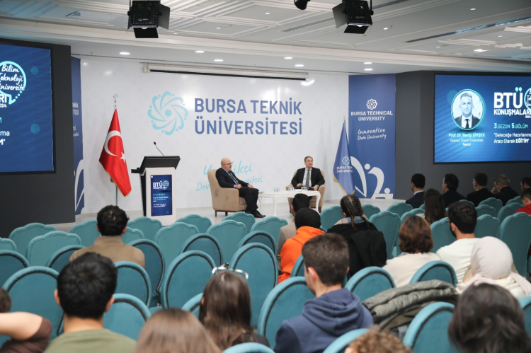 BTÜ Konuşmaları’nın 3’üncü sezon 25’inci bölüm konuğu, İstanbul Ticaret Üniversitesi Rektörü Prof. Dr. Necip Şimşek oldu. İstanbul Ticaret Üniversitesi Rektör Yardımcısı Prof. Dr. HanifiParlar’ın moderatörlüğündeki programa; BTÜ Rektörü Prof. Dr. Naci Çağlar, Rektör Yardımcıları Prof. Dr. Beyhan Bayhan, Prof. Dr. Sinan Uyanık, Prof. Dr. Barış Tamer Tonguç, akademisyenler ve öğrenciler katıldı. “Geleceğe Hazırlama Aracı Olarak Eğitim” başlıklı konuşmasıyla öğrencilerle buluşan Rektör Necip Şimşek, eğitimin bireyleri nasıl değiştirdiğini anlatarak, “Eğitimin bizi değiştirmesi için kendimizi teslim etmeliyiz ki alıp bizi bir yerlere götürsün. Eğitimin diğer yandan da bir amaca hitap etmesi gerekir. Eğitimi bilgiyle, bilgiyi de güç olarak tanımlıyoruz. Çünkü bilgisi olanlar güçlü olanlardır demek. Bilgi çok değerli, bilgiyi kullandığımız yer ise çok önemli. Biz bir bilgiyi amaca yönelik olarak kullanarak sonuç elde etmek istiyoruz. ‘Niye üniversite okuyorum’ sorusunun cevabı olması lazım ki gereğini yapabilelim. Eğitim bizi ancak teslim olarak, ardından bilgiyle donatarak ve aklımızı, vicdanımızı ikna eden bilgilerle değiştirir. Değişmek istiyorsak eğitimin içine girmeliyiz, bunları da bilgiyi kullanarak yapmalıyız” dedi.