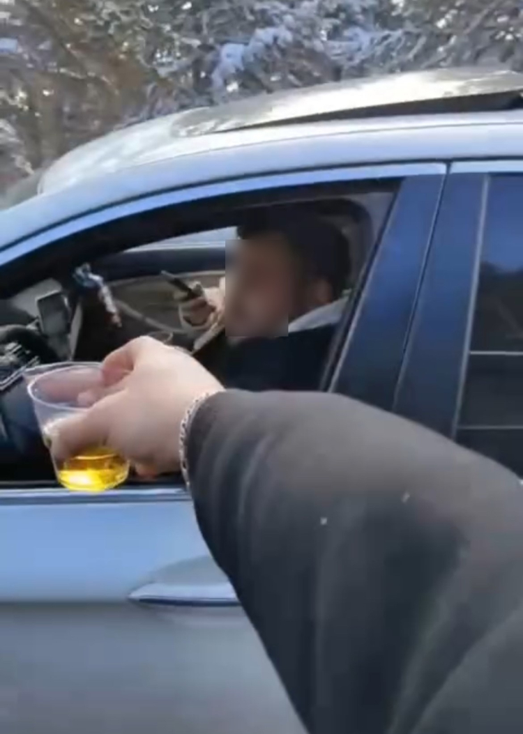 Bursa Uludağ yolunda ilerleyen otomobil sürücüsü, yanına başka bir araçla yanaşan arkadaşı ile seyir halindeyken alkol alıp kadeh tokuşturdu.