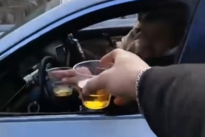 Bursa'da bir sürücü arkadaşıyla birlikte seyir halindeyken alkol alıp kadeh tokuşturdu.