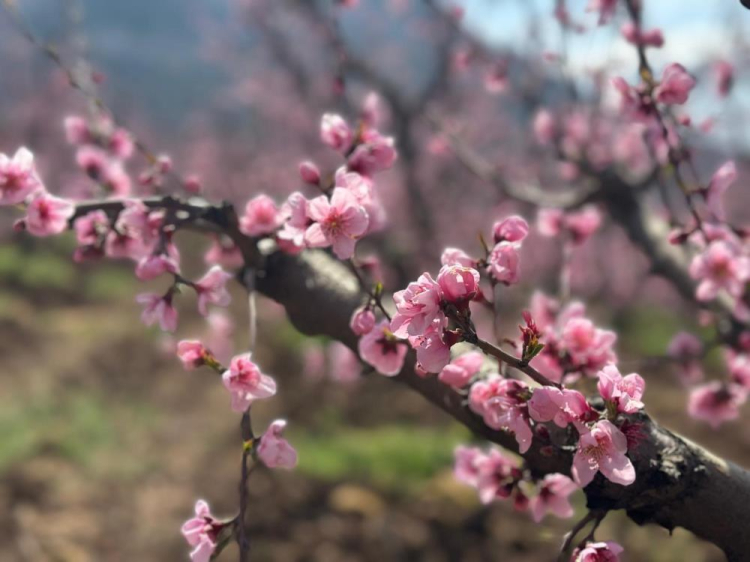 Yükseltilerin arasında, binlerce dekar griye çalan alanın ortasında göz kamaştırıcı bir manzara, bir umut isyanı yükseliyor. Yangının pençesinden sahiplerinin bakımları sayesinden kurtulan, dağların kuytusunda saklı 50 dönümlük şeftali bahçeleri, baharın gelişiyle pembe çiçeklere durdu ve büyüleyici bir görsel şölen sundu.