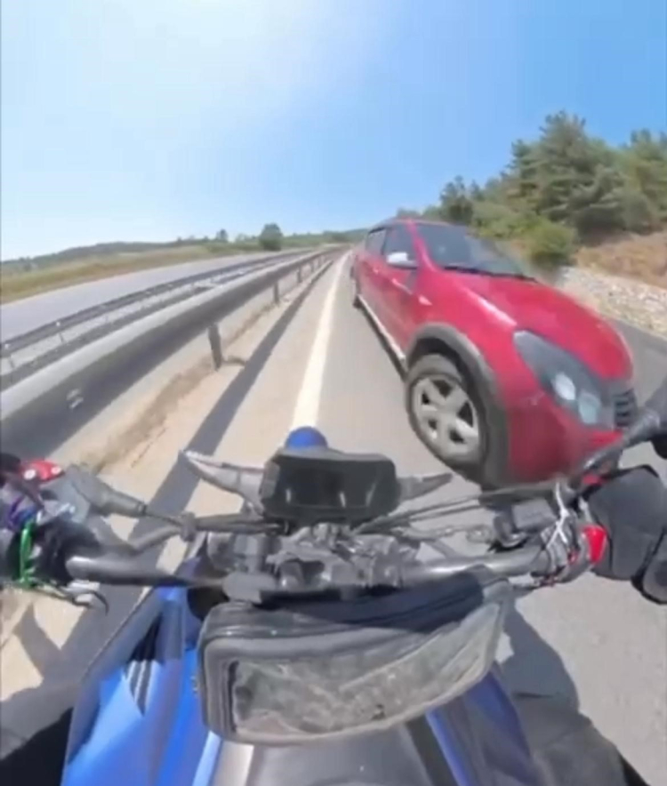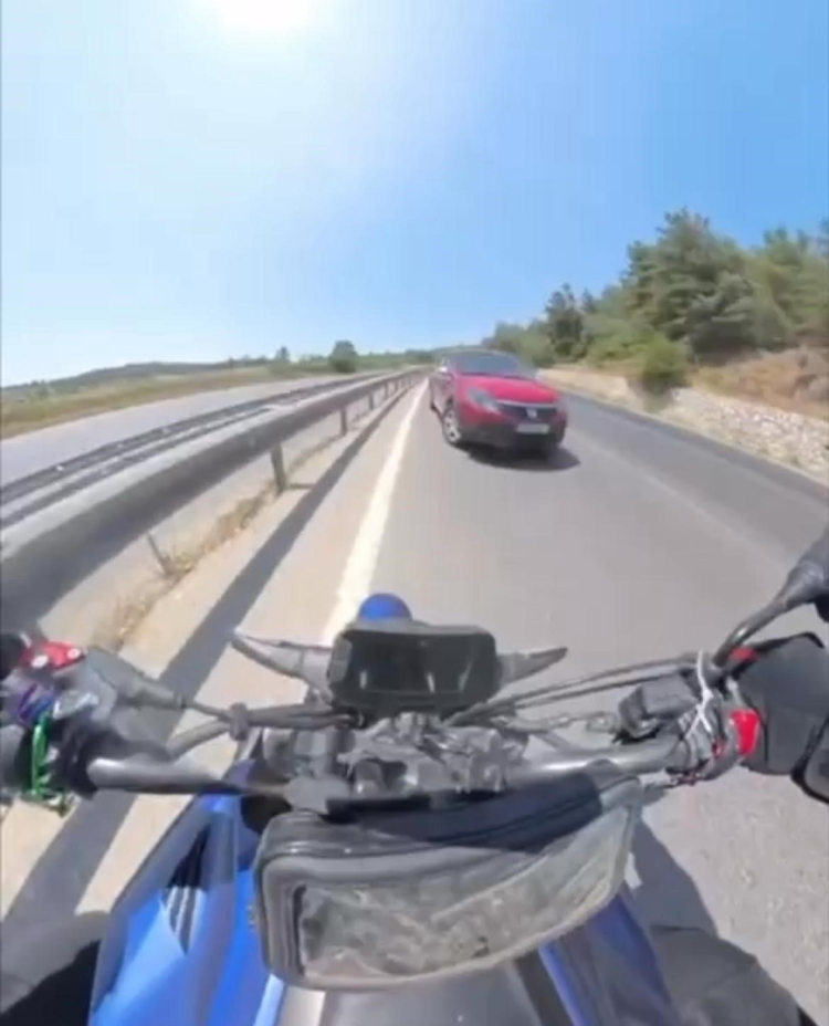 Sol şeritten hızla giden motosiklet sürücüsü tersten gelen otomobili son anda fark etti