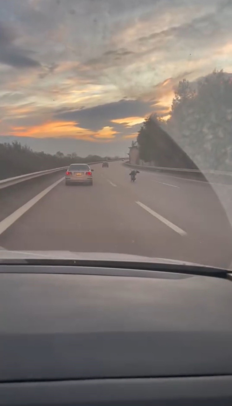 Yatarak motosiklet süren sürücü hem kendi canını, hem de diğer sürücülerin canını tehlikeye attı. Yüreklerin ağıza geldiği anlar, saniye saniye amatör kamera ile kaydedildi.
