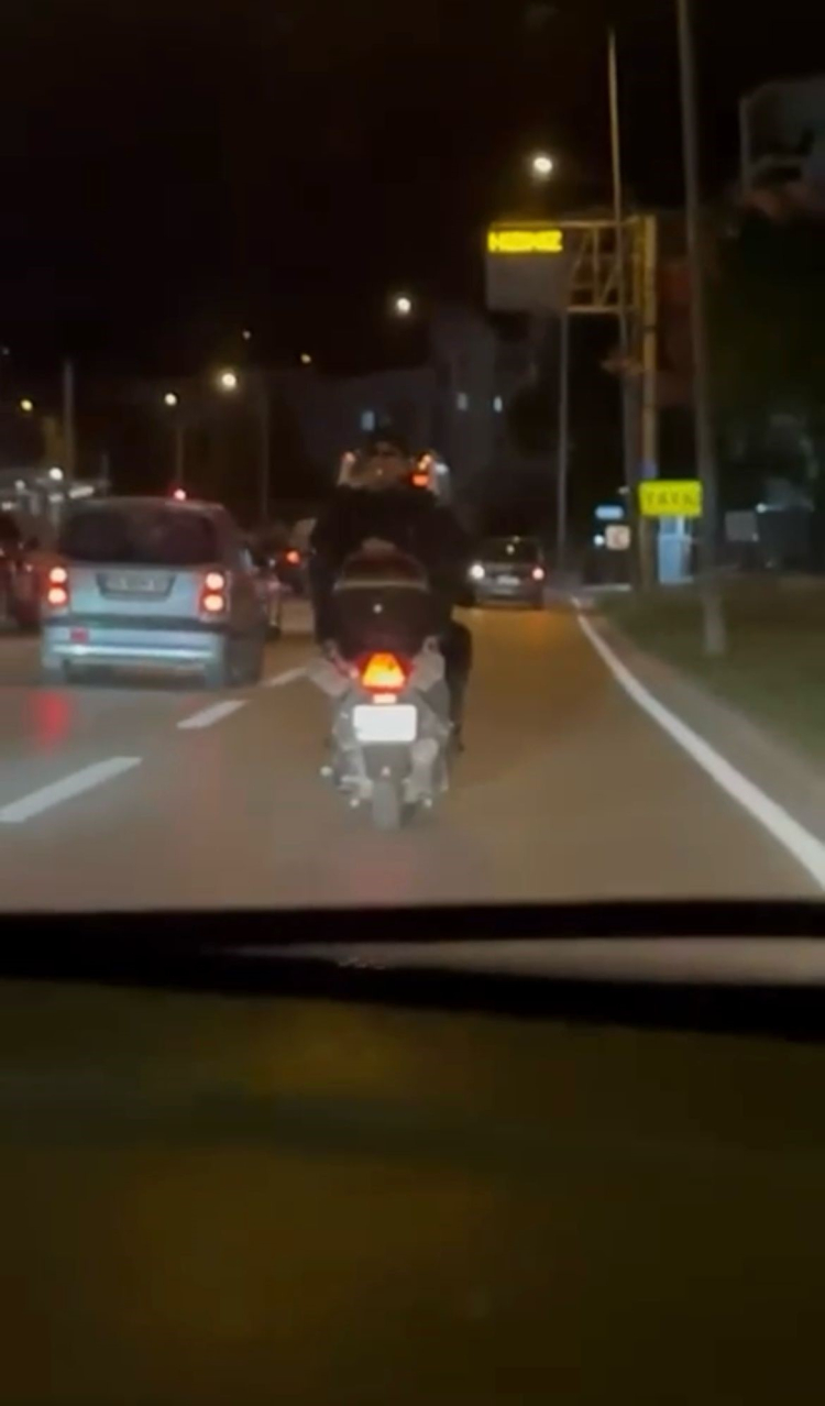 Bir süre sonra arkasına yolcu alan motosiklet sürücüsü, yolcuyu da ters bindirdi. Ters şeritten hızla seyreden motosiklet sürücüsünün tehlikeli anları, saniye saniye amatör kameraya yansıdı.