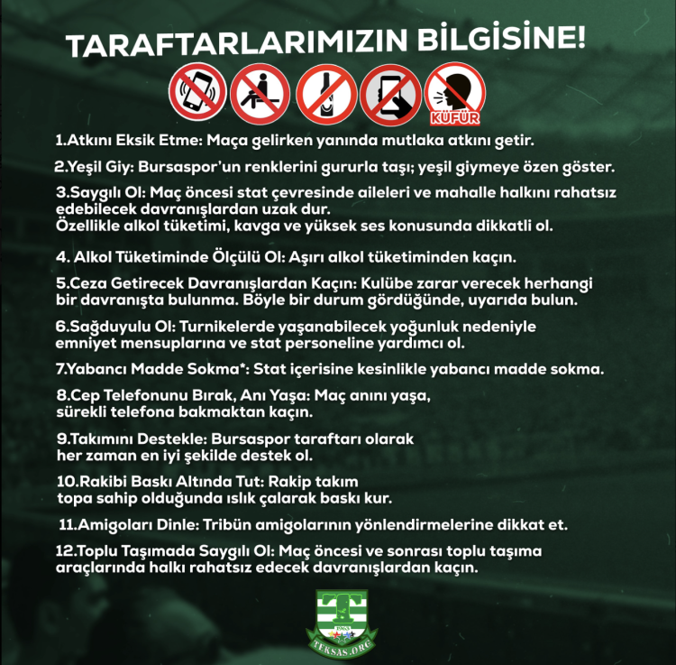 Bursaspor Taraftar Grubu Teksas, Bursasporlu taraftarlara oynanacak büyük maç öncesi çağrıda bulundu. Teksas'ın resmi hesabı üzerinden yaptığı çağrıda, ''Girdiğimiz bu kurtuluş mücadelesinde her bir Bursaspor taraftarı üzerine düşeni yapmalı. Stat çevresinde yaşayan halkı rahatsız etmemeye özen göstermeliyiz. Takımımıza ve kendimize ceza getirecek her türlü davranıştan kaçınmalıyız; çünkü ne kulübümüzün ceza almasını ne de tribünde bir kişi bile eksilmeyi göze alabiliriz. Şampiyonluk senemizde nasıl başarıya ulaştıysak, ait olduğumuz lige çıkana kadar da küfürsüz ve fair-play çerçevesinde bir taraftar profili sergilemeliyiz.'' açıklaması yapıldı.