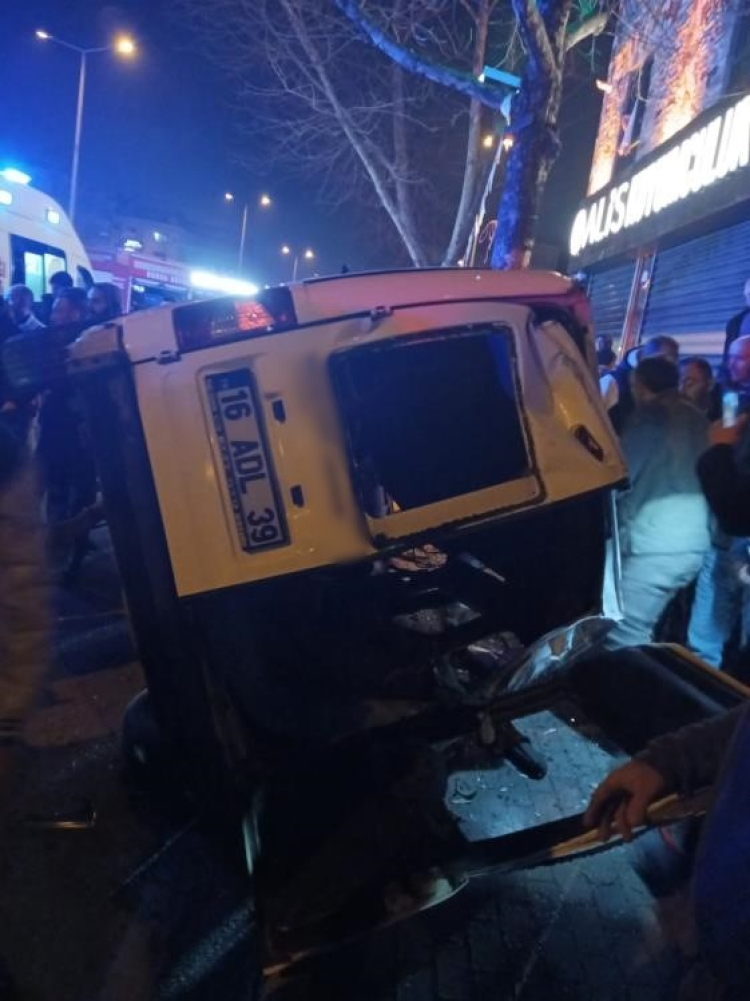 Bursa'da kırmızı ışıkta geçen hafif ticari araç önce direğe, daha sonra da takla atarak kaldırımdaki ağaca çarptı.