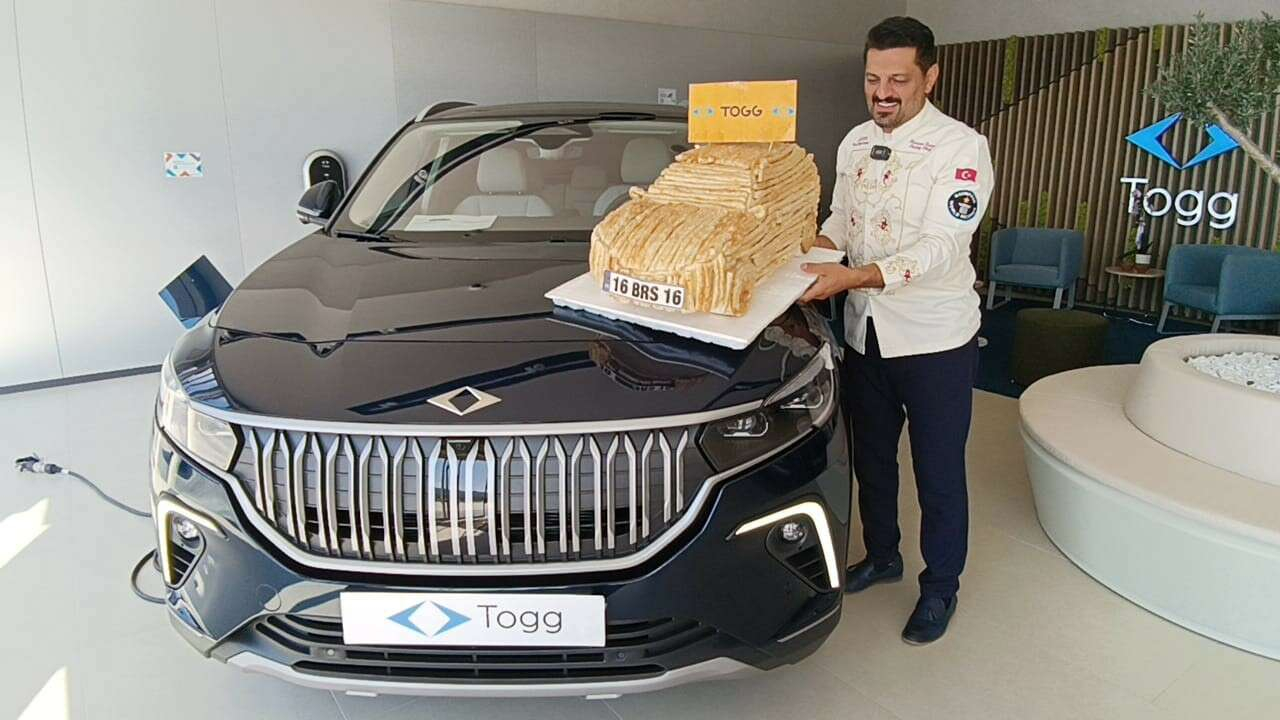 Bursa'lı rekortmen börekçi Hasan Acar, 177 bin başvuru arasından 4 bin 951'inci şanslı kişi olarak kendisine çıkan Togg otomobilini almaya börekten yaptığı Togg ile gitti. Börek Togg'u verip gerçeğini teslim alan Hasan usta Togg çalışanlarına da börek ikram etti.