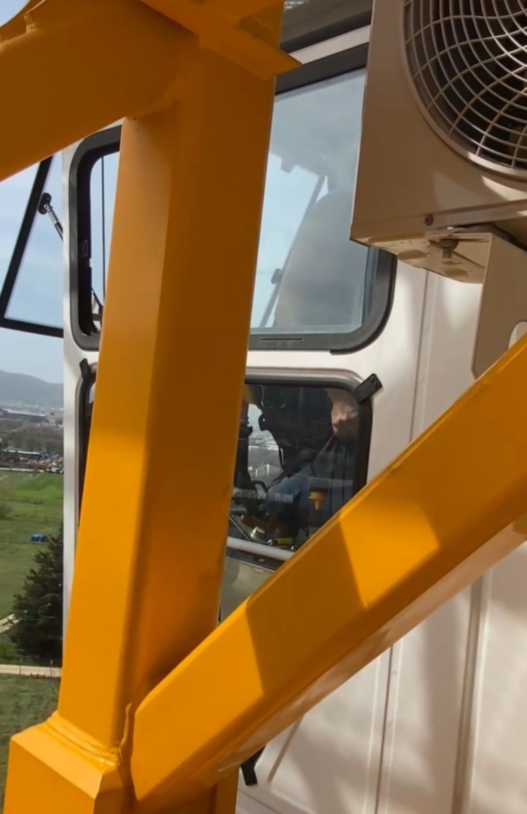 İtfaiye ekipleri, yaklaşık 50 metre tırmandığı vinçte mahsur kalan adamı kurtarıp sağlık ekiplerine teslim etti. Ekiplerin zamanla yarışı kameraya anbean yansıdı.