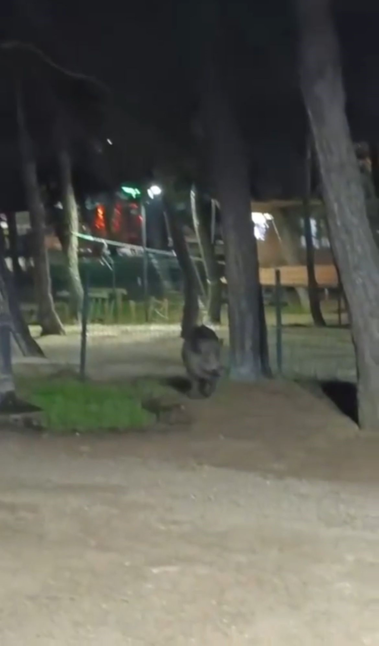 Akşam saatlerinde acıkan yaban domuzu, mesire alanına girdi. Bir süre gezinen domuz, piknik yapan vatandaşlardan kalan artıkları yiyerek karnını doyurdu. O anlar amatör kameraya yansıdı.