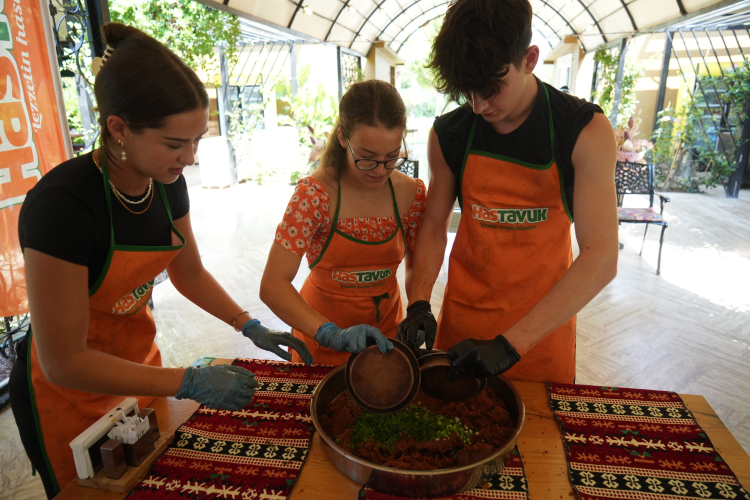 Örnek yemek olarak çiğköfte yapımı için kolları sıvayan öğrenciler, renkli görüntüler ortaya koydu.