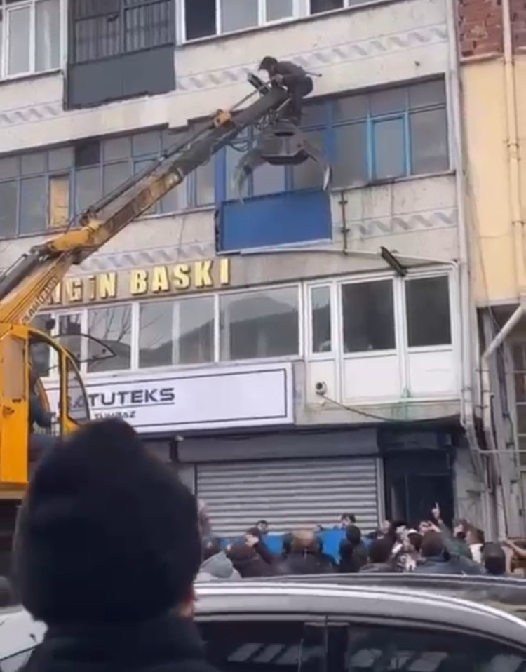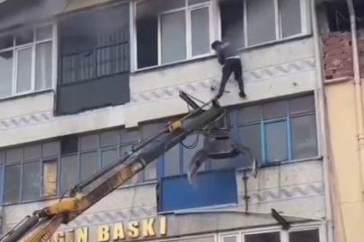 Yangında mahsur kaldı, camdan atlamak üzereyken yardımına vinç operatörü böyle yetişti