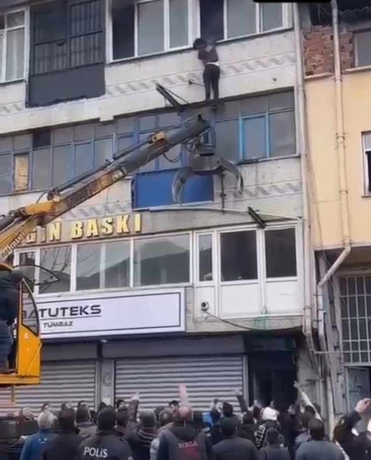 Bursa'nın Yıldırım ilçesi Duaçınar, Karlıdağ Caddesi üzerinde bir tekstil üreticisi olarak faaliyet gösteren iş yerinde yangın çıktı. Alevlerin sardığı binada mahsur kalan bir vatandaş ise kendisini cama sarkıttı. Bu esnada vatandaşın atlamak üzere olduğunu fark eden vinç operatörü hemen binaya yaklaşıp mahsur kalan vatandaşa uzandı.