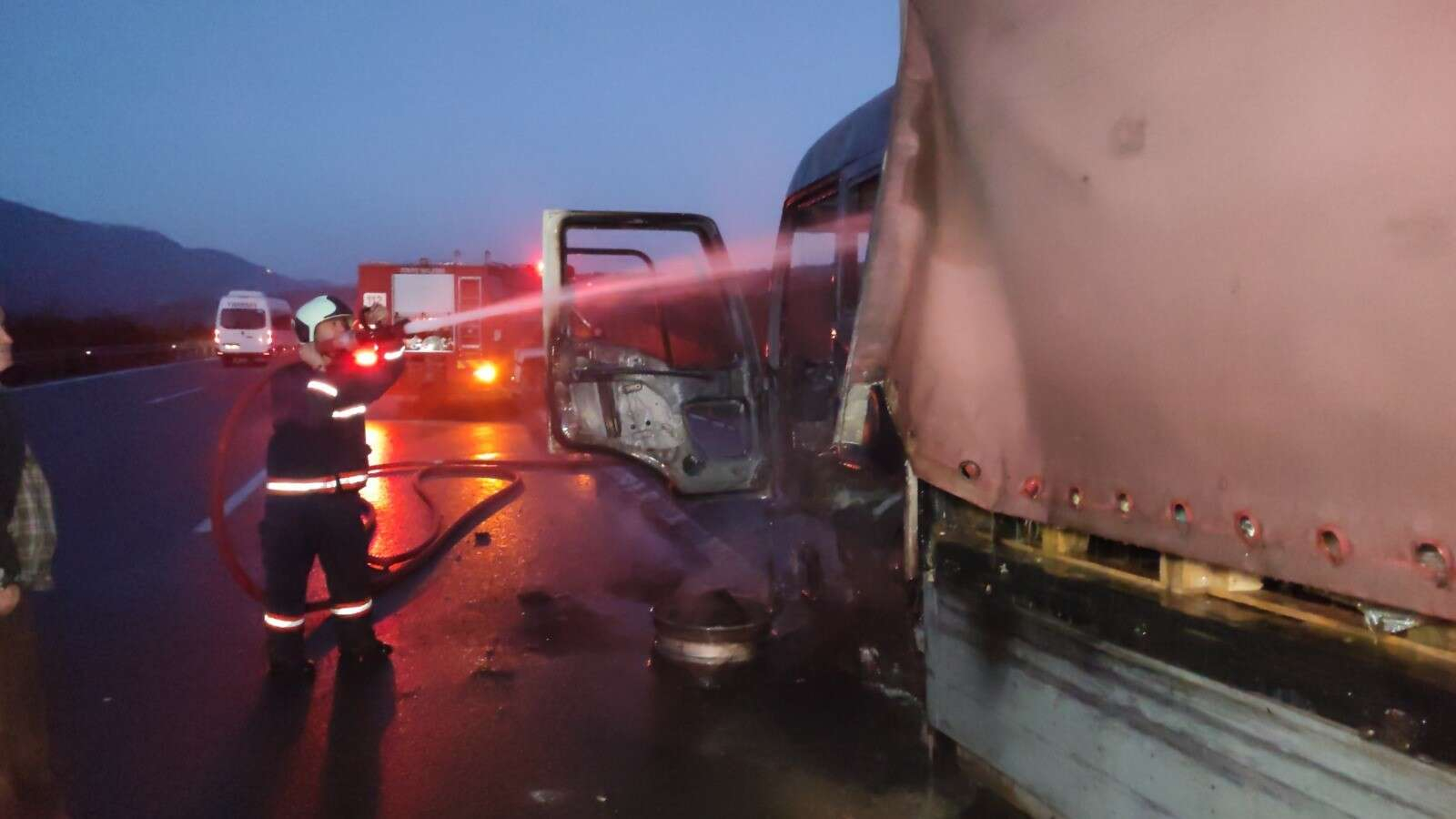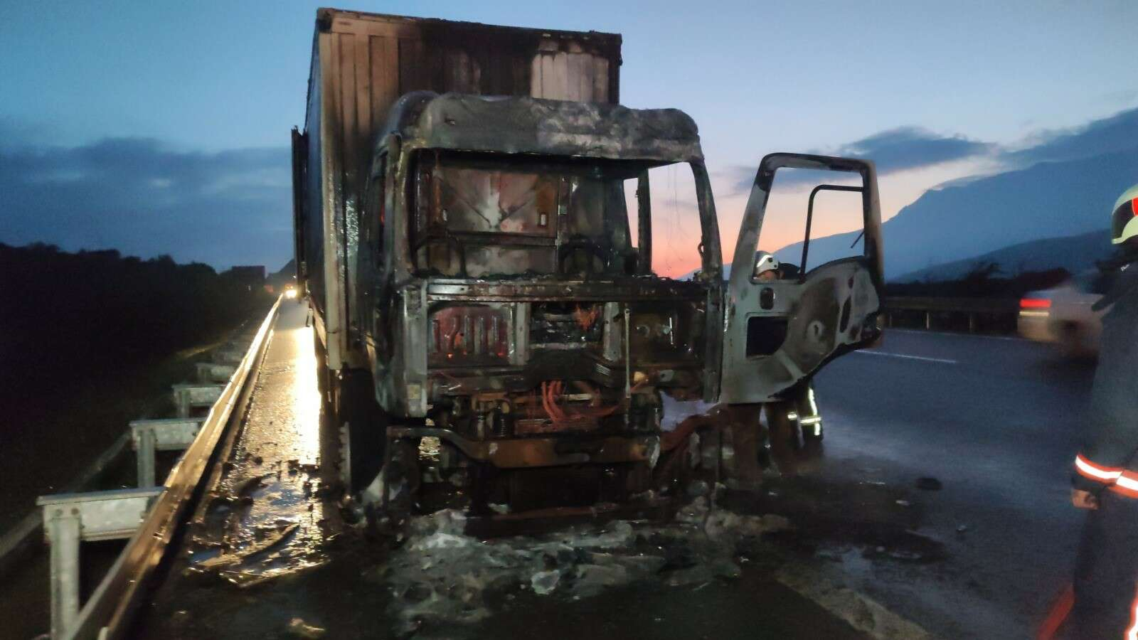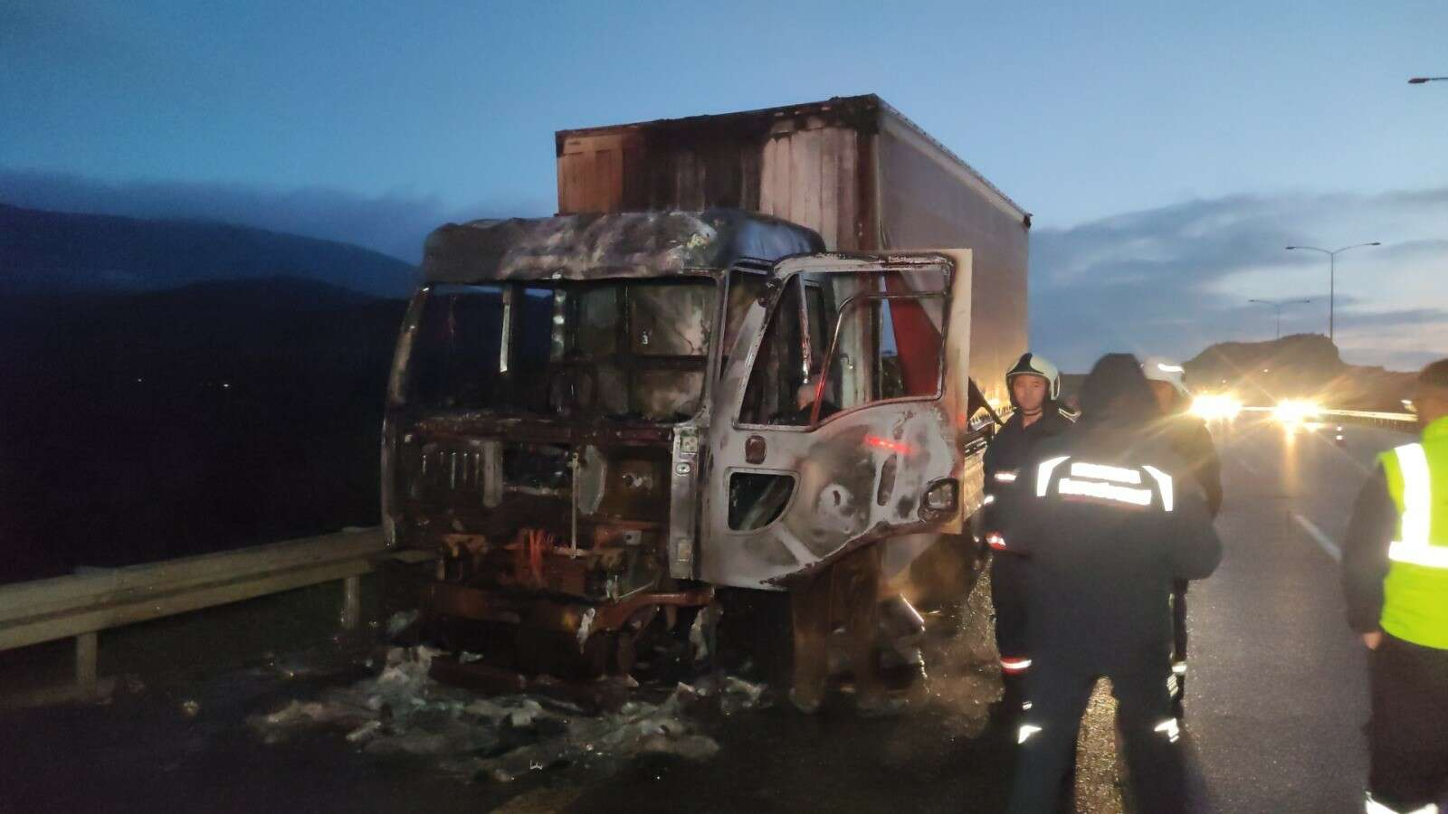Sürücüsünün son anda emniyet şeridine çekip indiği kamyon alev topuna dönerken, itfaiye ekiplerinin müdahalesi ile yangın söndürüldü. Araç kullanılamaz hale geldi.