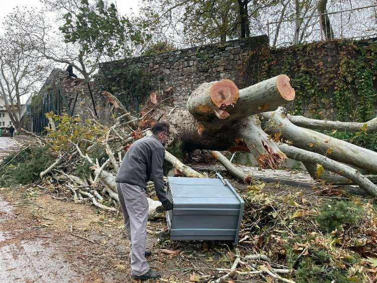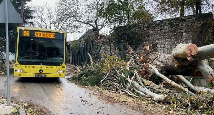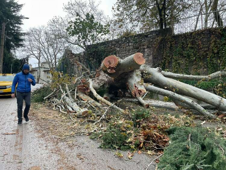 Saatteki hızı 95 kilometreye ulaşan fırtına sebebiyle devasa çınar kökünden koparak yola devrildi.