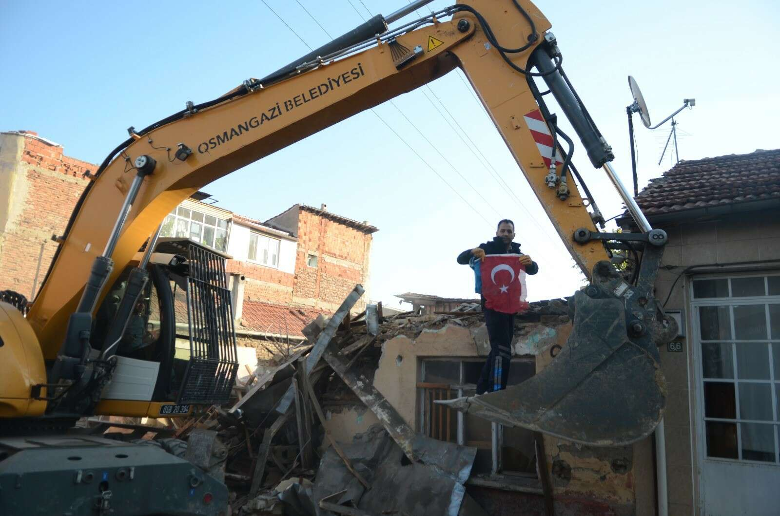 Osmangazi Belediyesi tarafından Küplüpınar Mahallesi’nde gerçekleştirilen metruk bina yıkımı esnasında çatıda duran Türk Bayrağı’nı zarar vermeden binadan alan iş makinası operatörü çevredekilerden alkış aldı.