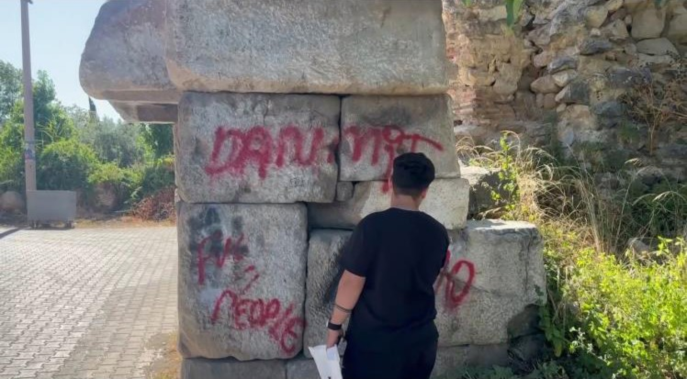 Bursa'nın İznik ilçesinde 2 bin yıllık tarihi surlara sprey boya ile yazılan yazılar tepki çekiyor.
