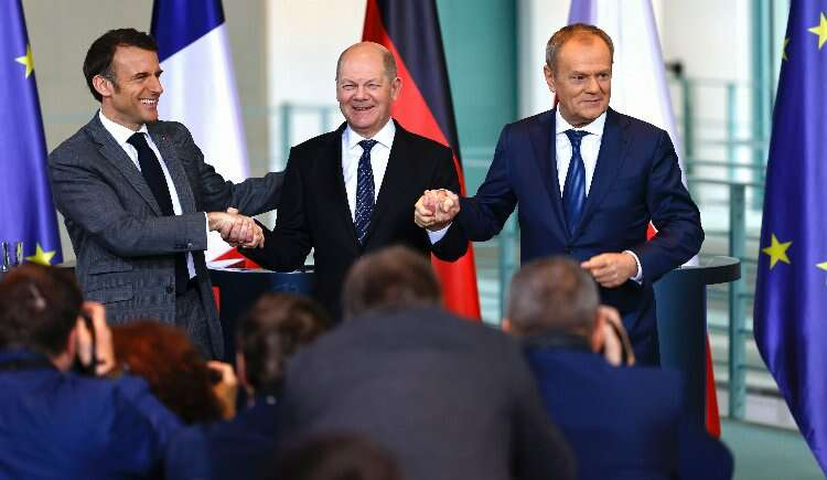 Almanya Başbakanı Olaf Scholz, Fransa Cumhurbaşkanı Emmanuel Macron ve Polonya Başbakanı Donald Tusk'un katılımıyla gerçekleşen Weimar Üçlüsü toplantısında, "Ukrayna'yı destekliyoruz ancak Rusya ile savaş içerisinde değiliz" açıklamasında bulundu.