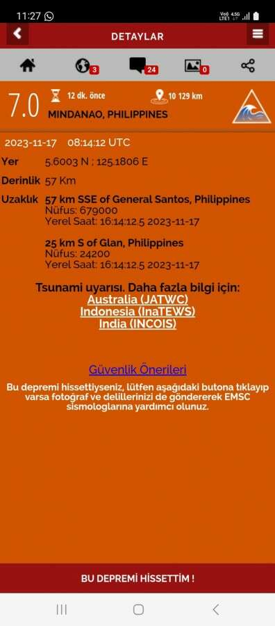 Edinilen bilgilere göre, Filipinler'de 7.0 büyüklüğünde deprem meydana geldi.