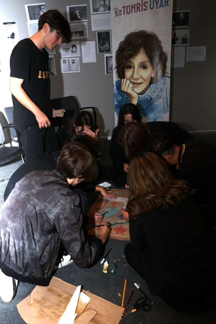 Öğrencilerin etkinlik sayesinde Tomris Uyar’ı daha yakından tanıdıklarını ifade eden Eğitmen Serdar Solkun, “Yaptığımız çalışmalarda Uyar’ın geçmişte yanan Suya Yazılı adlı kitabının kapağını hayal ederek tasarladık