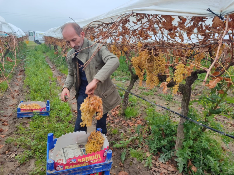 Sarıgöl'ün Koçaklar Mahallesindeki bağında üzüm hasadına devam eden üretici Musa Topdemir, "2024 yılı ürünlerimizin 2025 yılında da hasadına devam ediyoruz. Bağımda bir iki günlük işim kaldı. Taze üzümlerimiz dalında. Üzüm deyince akla ilk cennet geliyor. Cennetten gelen bitki olarak bilinir. Dalında 8 ay boyunca 22 boğum olarak kalan tek bitkidir. O yüzden doktorlar üzümü hastalıkları önleyici antioksidan ve şifa kaynağı olarak kabul etmiştir. Şu anda da dünyanın en verimli topraklarında bunu kanıtlamış olduk. Burası dünyanın merkezi. 2024 üzümlerinin satışlarına hala devam ediyoruz. Üzüm 130 günde oluşur. Saklama süresi ise 1 yılı bulduğu ispatlanmıştır. Buradan tüm ihracatçılarımıza sesleniyorum. Gelin çiftçiyi kurtarmak için depoda değil, üzümlerimizi dalında saklayalım. Organik üzümlerimizi bugün rekabet ettiğimiz Mısır, Özbekistan, İran ve Afrika ülkelerinin önüne geçeceğimiz şekilde ürünü dalında ne kadar fazla tutarsak o kadar değerli olduğunu gelin dünyaya bu örtülerle tanıtalım. Örtü altı ve damlama sulama sistemi ile ürünlerimizi bir yıl saklayabildiğimiz artık ispatlanmıştır. Dünya tüm tarihinden beri üzümü yetiştirme şeklini araştırmış, ardından üzümü ne kadar uzun süre saklarız da tıbbi bir bitki olur düşüncesine devam etmiştir. Üzümlerimizi 8 ay boyunca dalında saklayıp dünya pazarını yeniden ele alalım" diyerek hem ihracatçılara hem de üreticilere Sarıgöl'den çağrı yaptı.