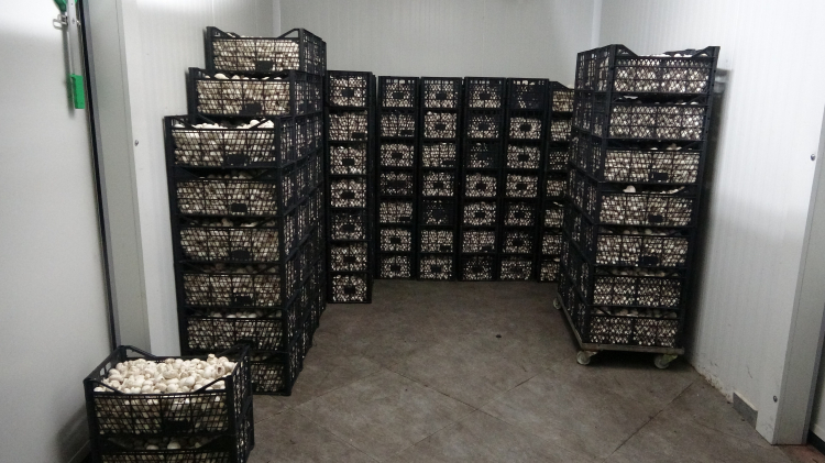 İşçiler tarafından yaklaşık olarak 9 kilogram kapasiteli kasalara toplanan mantarlar, soğuk hava deposunda bekletiliyor.
