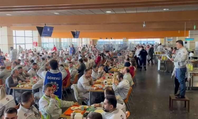 Türk Metal Sendikası adına yemekhanede işçilere bildiri okuyan Türk Metal Sendikası Tofaş Bölge Sorumlusu Mustafa Molla, "2023 - 25 toplu iş sözleşmelerinde 3,5 ayı geride bıraktık. Bu zaman zarfında elimizde sadece işveren sendikası MESS tarafından bize dayatılan yüzde 35'lik bir ücret zammı teklifi var.