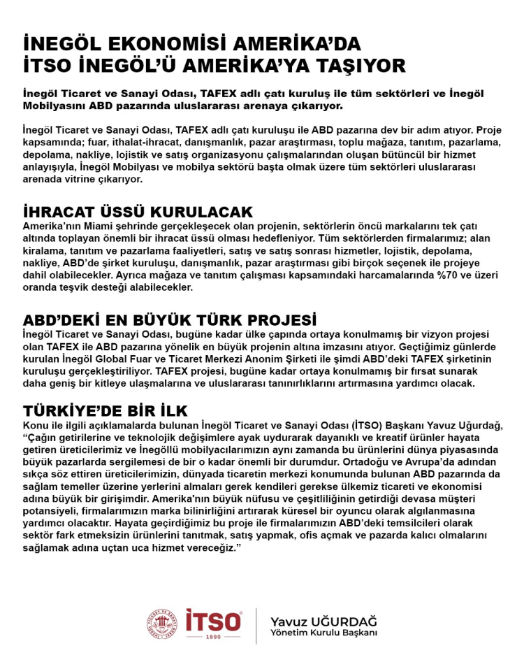 Başkan Yavuz Uğurdağ, "İnegöl Ticaret ve Sanayi Odası olarak, 2025 yılında ABD pazarında çeşitli hizmetler sunacak bir projeye başladık.