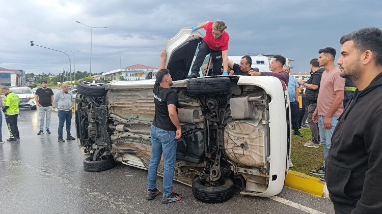 Antalya'nın Manavgat ilçesinde meydana gelen trafik kazasında otomobillerden biri çarpışmanın etkisiyle savrulup refüje çarparak yan yattı.
