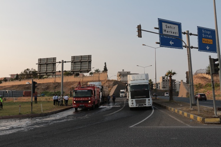 Cizre-Silopi Çevre yolunda İzettin Tekin yönetimindeki 47 PV 095 plakalı tırın balata kısmında oluşan ısınmadan dolayı alevler yükselmeye başladı.
