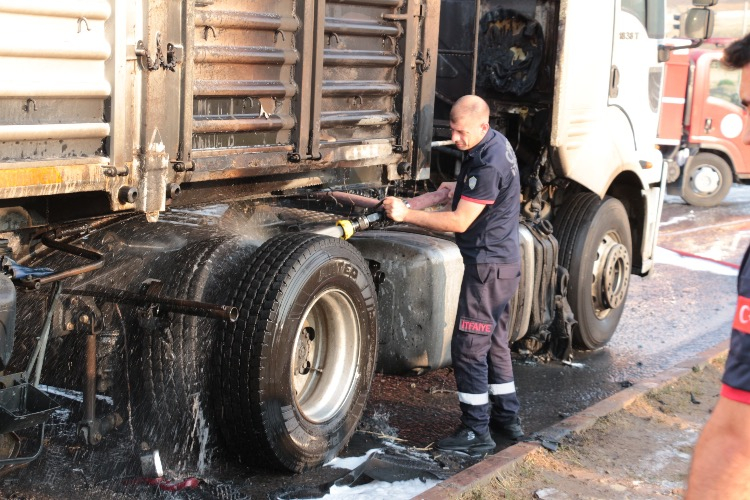 Sürücü, tırdan yükselen alevleri fark edip aracı yol kenarına çekerek 112 Acil Çağrı Merkezine ihbarda bulundu.