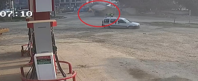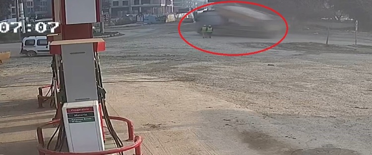 Hatay’da çakıl yüklü hafriyat kamyonunun virajı alamayıp devrildiği ve çakılların döküldüğü anlar güvenlik kamerasına yansıdı.