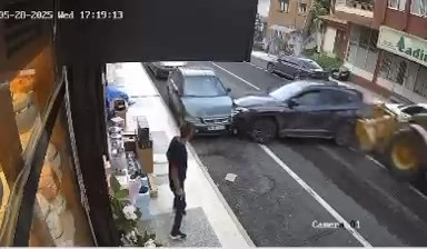 Hatay'da freni arızalanan kepçe sürücüsünün kontrolünden çıkarak park halindeki ve trafikteki 4 araca çarptı. Kepçe sürücüsü hafif şekilde yaralanırken, kaza anı kameraya yansıdı.