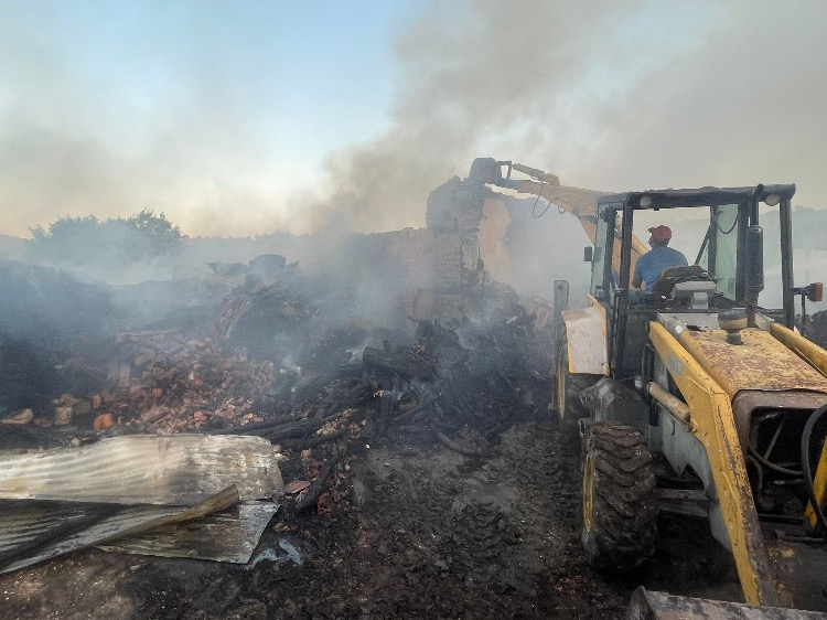 Yangın sonrası harabeye dönen ev ve ahır iş makineleri tarafından yıkıldı.