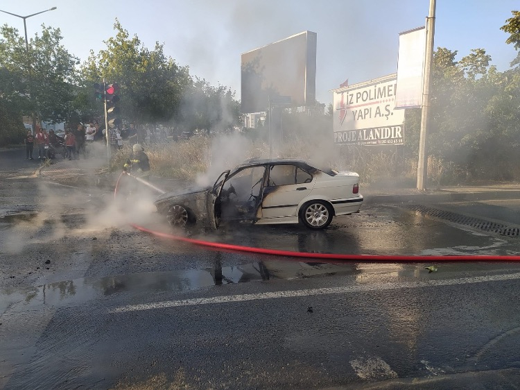 Tekirdağ Çorlu’da seyir halindeyken motoru alev alan LPG’li otomobil, hurdaya döndü.