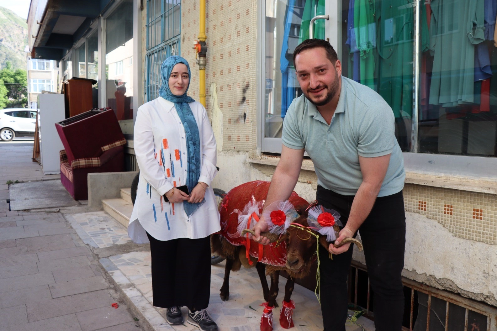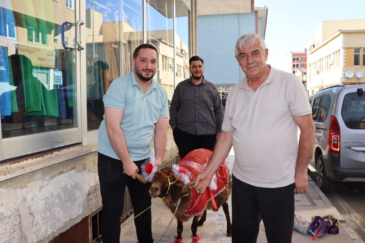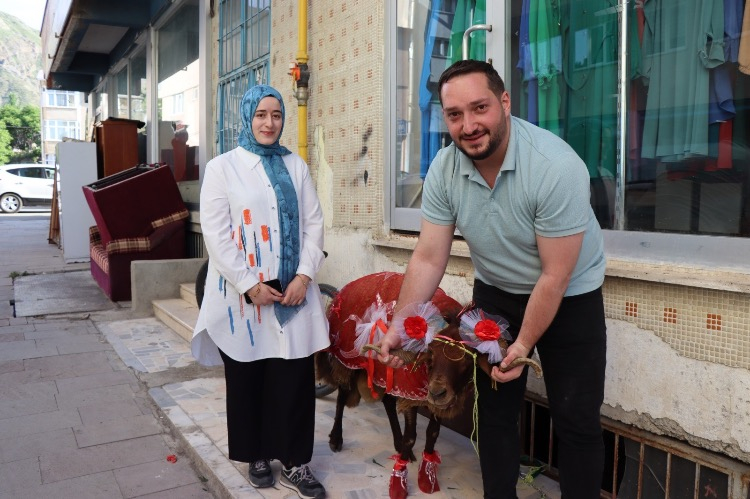 Erzurum’da ikamet eden Doktor Muhammet Enes Batman, nişanlısı Sema Coşkun için özel olarak süslediği kurbanlık koçu hazırlayıp ailesiyle birlikte Oltu’daki kız evine teslim etti. Yöre geleneğine göre nişanlı gençler, bayram öncesinde nişanlılarına süslenmiş kurbanlık koç hediye ediyor.