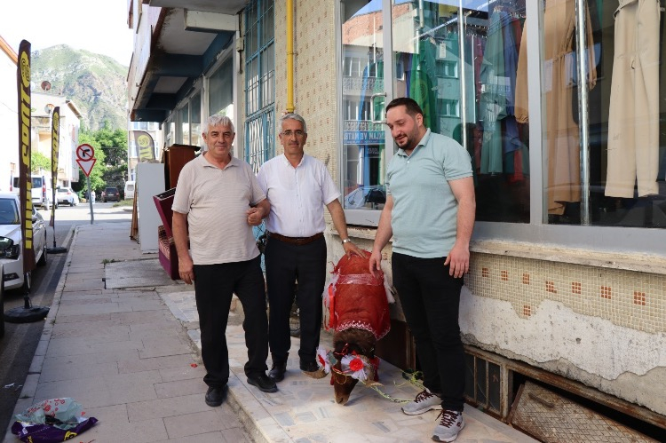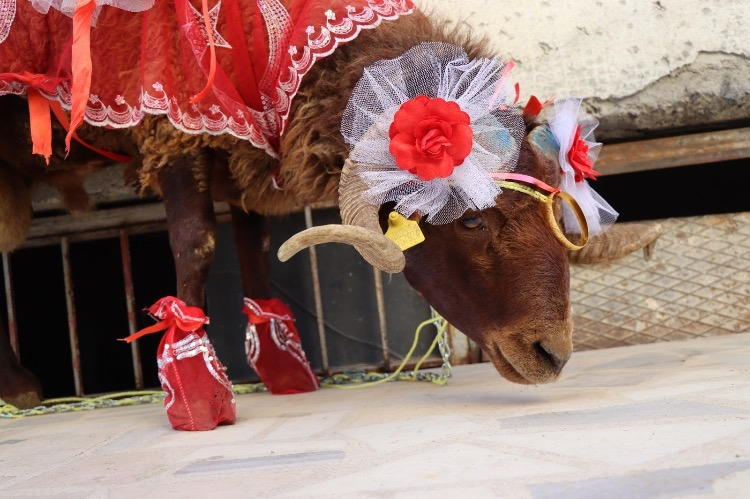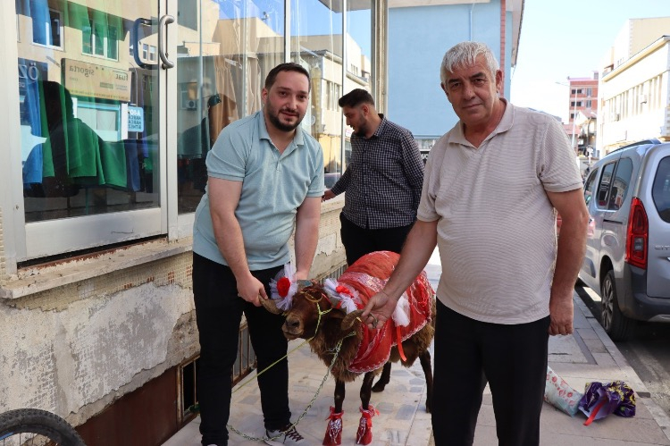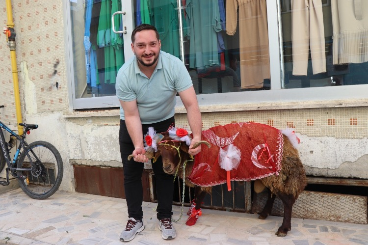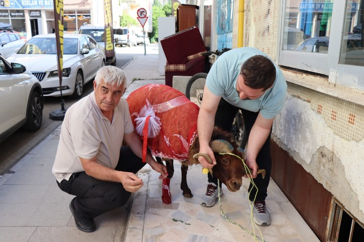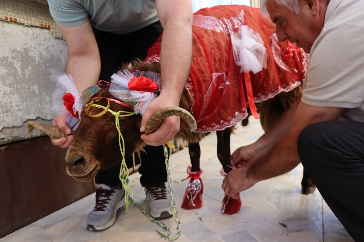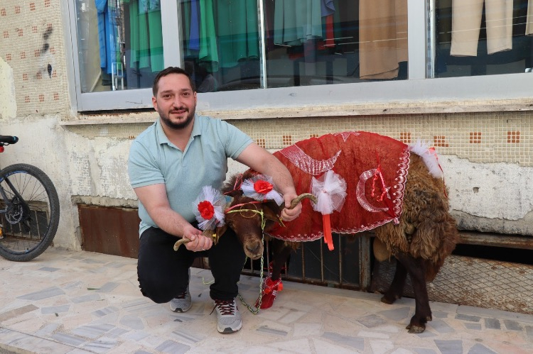 Bu kapsamda damat adayı Muhammet Enes Batman, aldığı koçun boynuzlarına altın bilezik takarak onu özenle süsledi.