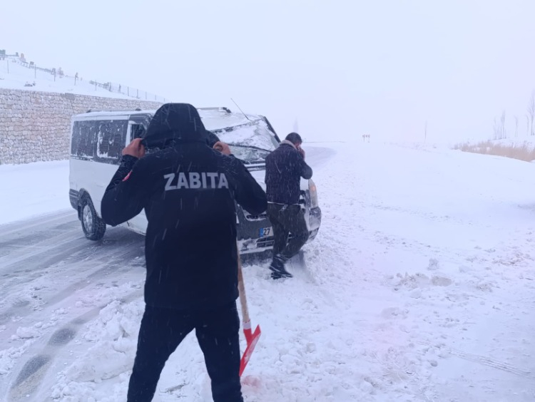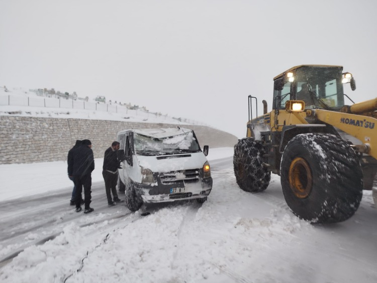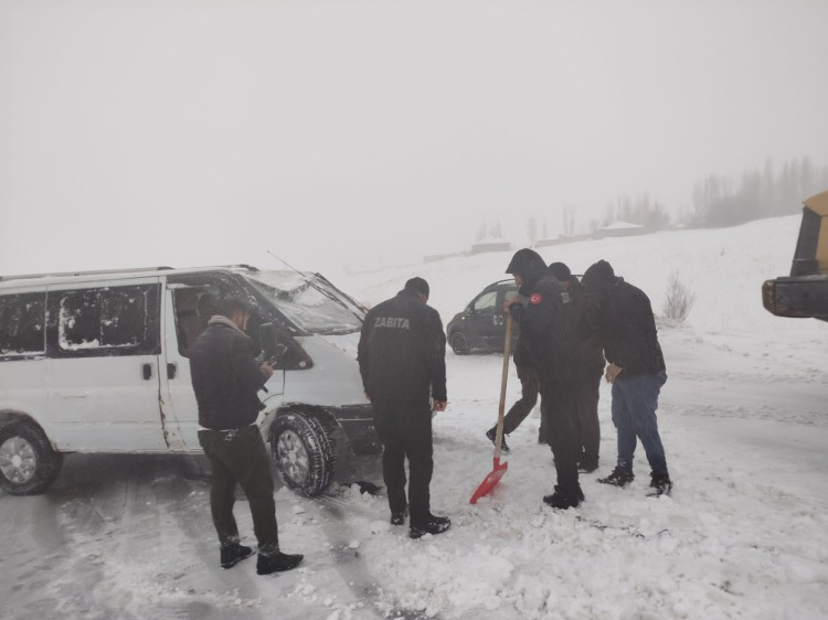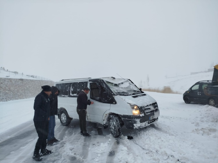 Van'ın Başkale ilçesinde kontrolden çıkan minibüs, yol kenarındaki kar birikintisine saplandı.