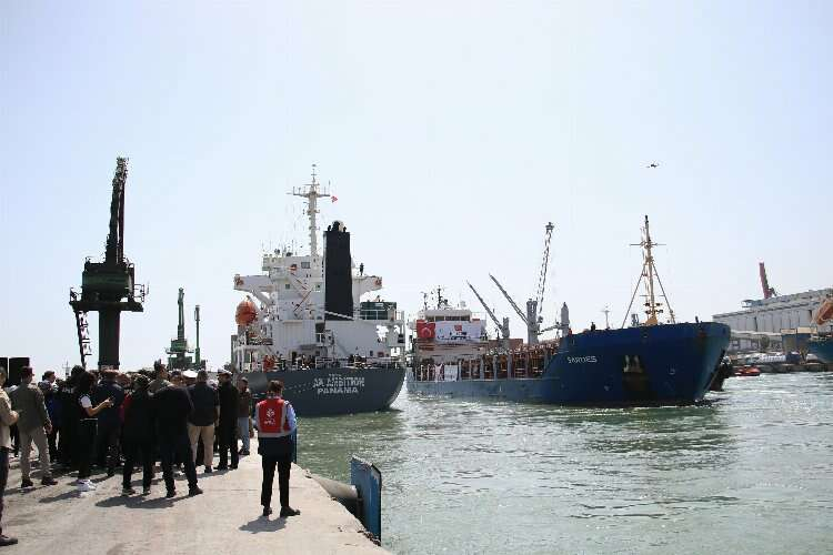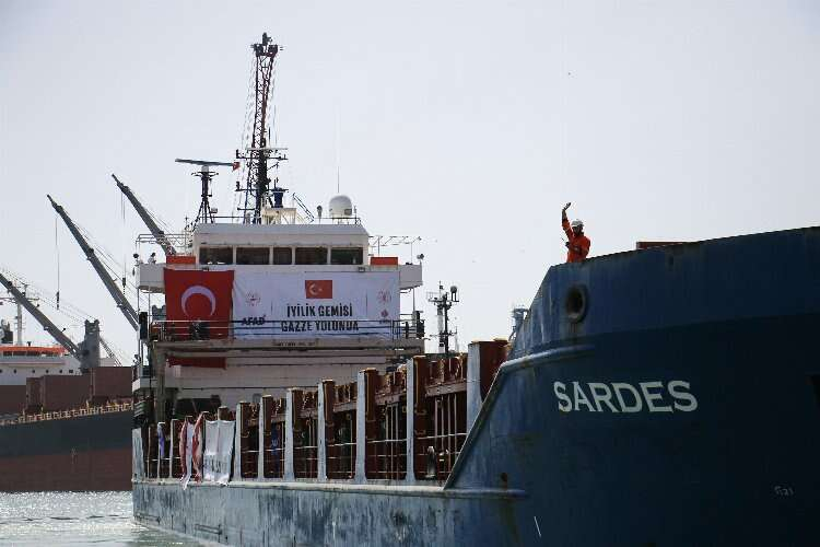 İsrail saldırılarının hedefinde olan Gazze Şeridi'ndeki siviller için hazırlanan 125 bin gıda kolisi yüklü "Sardes" adlı gemi, duaların ardından yola çıktı.