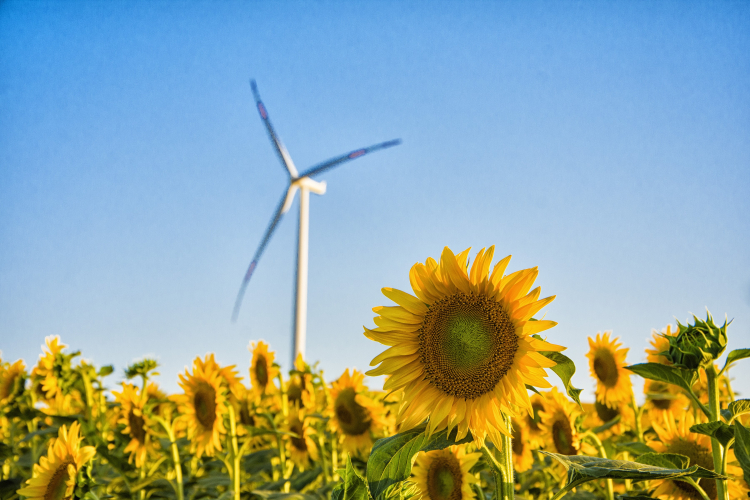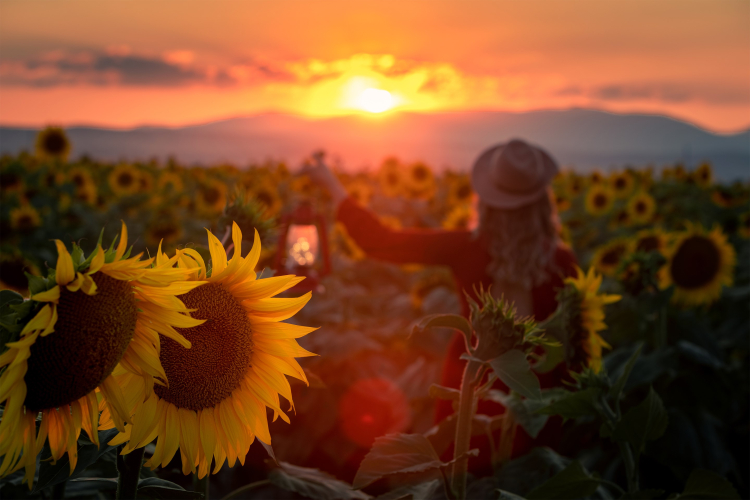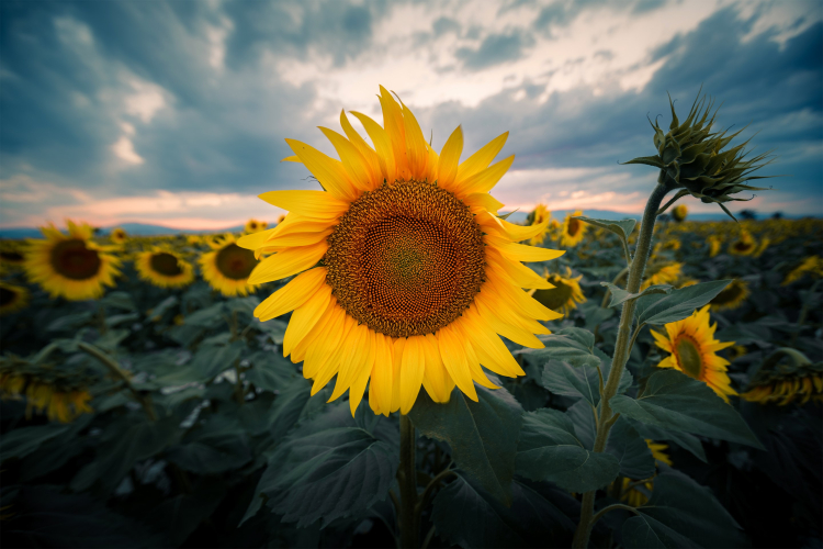 Ayçiçeğinin sarı rengi ve renkli görüntüleri, gökyüzünün mavisiyle birleşerek eşsiz bir manzara sunuyor.
